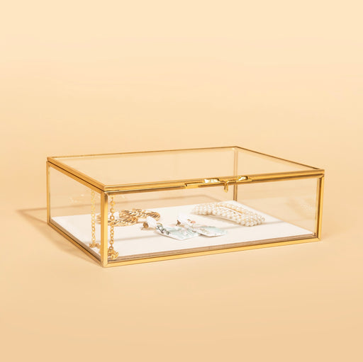 Glass Gold Metal Chain Jewelry Organizer Box with Velvet Bottom