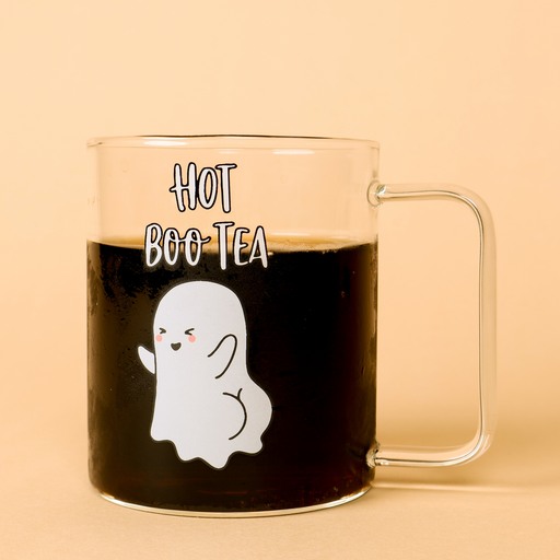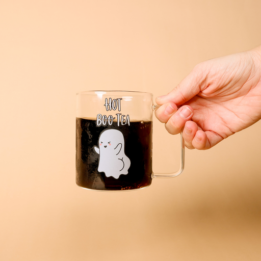 In stockBrighten up your mornings this Fall with our Hanna Roberts, Cute Boo Ghost “Hot Boo Tea” Glass Mug with handle. Perfect for drinking hot or cold dr...