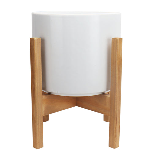White Ceramic Pot Planter with Reversible Height Wood Stand